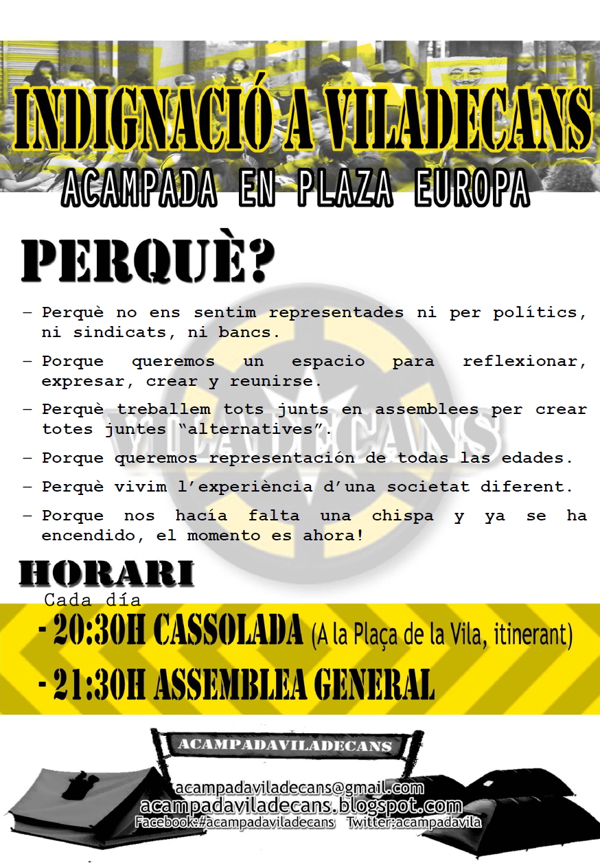 Dit això avui com sempre seguim tenint els mateixos horaris, a les 20:30h Cassolada a la Plaça de la Vila i a les 21:30h Assemblea general a la Plaça Europa, i després ACAMPEM!