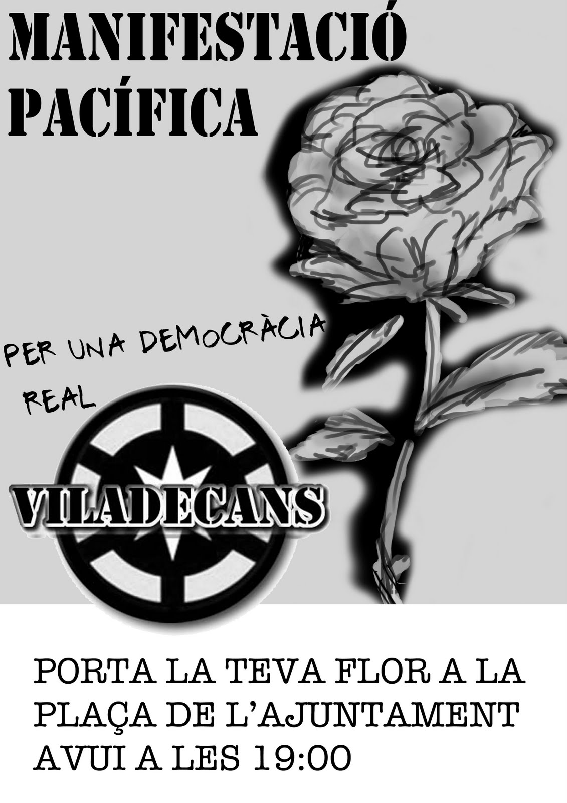 Avui a la Plaça de la Vila de Viladecans, abans de l'habitual Cassolada i posterior Assemblea, està convocada una Manifestació Pacífica en protesta de la Violència rebuda aquest matí als companys d'acampadaBCN a Plaça Catalunya! Us esperem amb flors i cassoles!