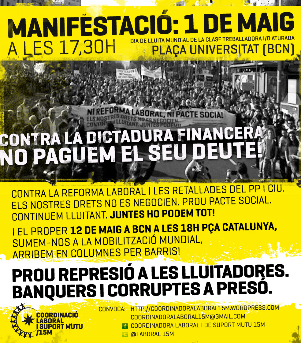 En uns moments d'autèntica cacera de bruixes, l'estratègia de la por engegada per Felip Puig, sobredimensionant els fets de la vaga del 29M, sembla una tàctica desesperada. Som conscients de que la pressió és forta, i nosaltres també ho hem de ser. L'1 de maig hem de demostrar que hem perdut la por de sortir al carrer. Que no ens arronsin!